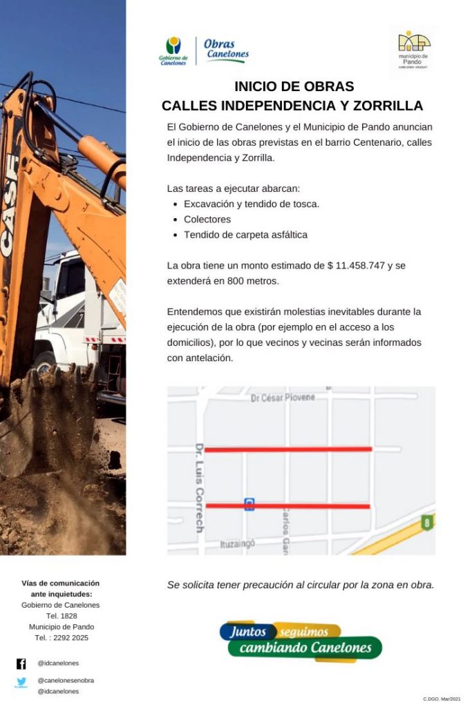 El Gobierno de Canelones y el Municipio de Pando comunicaron el inicio de las obras previstas en barrio Centenario, calles Independencia y Zorrilla. Las tareas a ejecutar abarcan, excavación y tendido de tosca, colectores, y tendido de carpeta asfátltica.