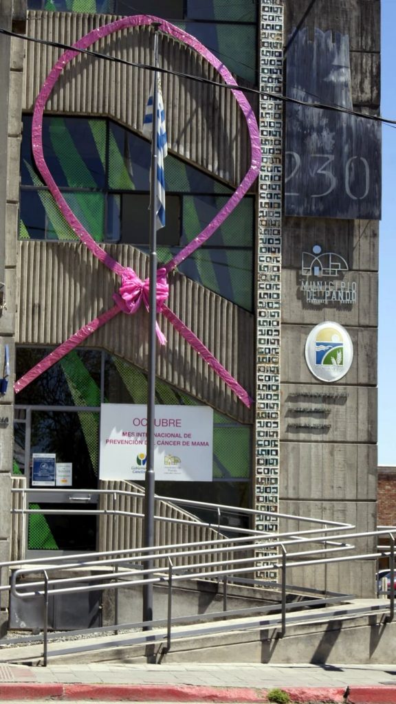 Foto: El Municipio de Pando se suma a la campaña de concientización de esta enfermedad, a través de la instalación de un gran lazo rosado en la fachada del edificio municipal.