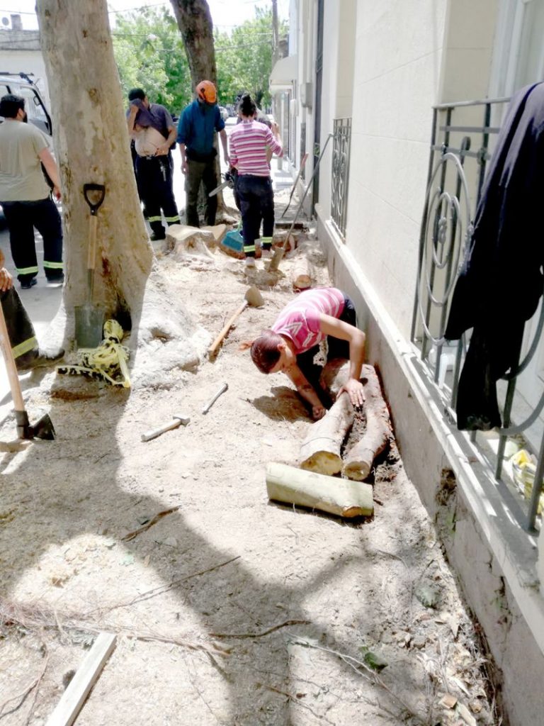 La tarea no fue fácil, un viejo Plátano extendió sus raíces por encima de los niveles de la vereda haciendo imposible la circulación y afectando el piso de las instalaciones del centro educativo.
