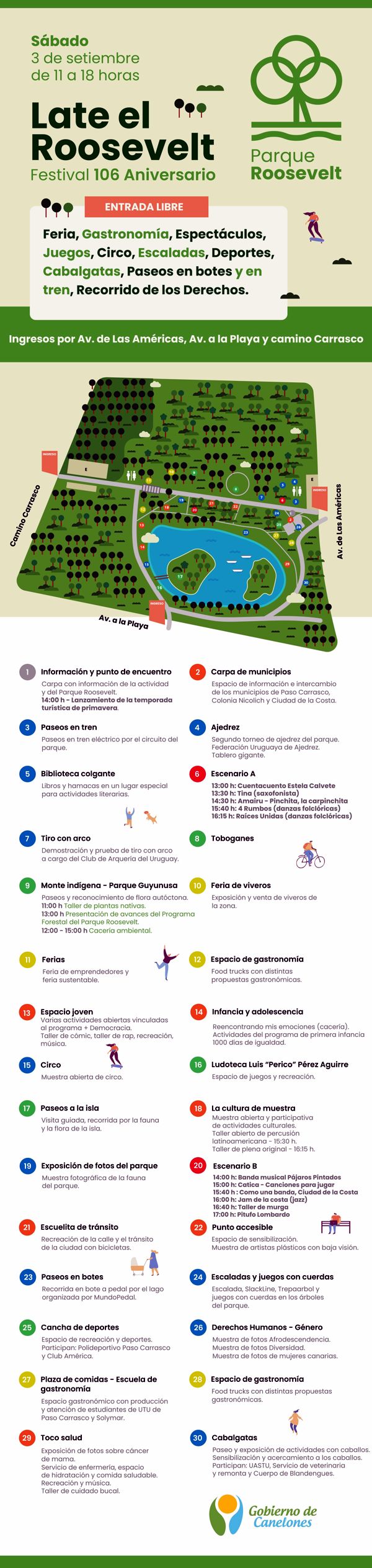 El próximo sábado 3 de setiembre, de 11:00 a 18:00 horas, se realizará el festival Late el Roosevelt, en el marco de un nuevo aniversario del parque. La entrada será gratuita y habrá tres ingresos: por Av. de las Américas, Av. a la Playa y camino Carrasco.