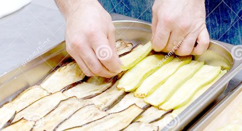 Colocamos alternado una capa de zapallito cortado en rodajas, otra capa de berenjenas cortadas en rodajas y otra capa de morrón, condimentado y espolvoreado con la mezcla de ajo, perejil y tomillo entre capa y capa.