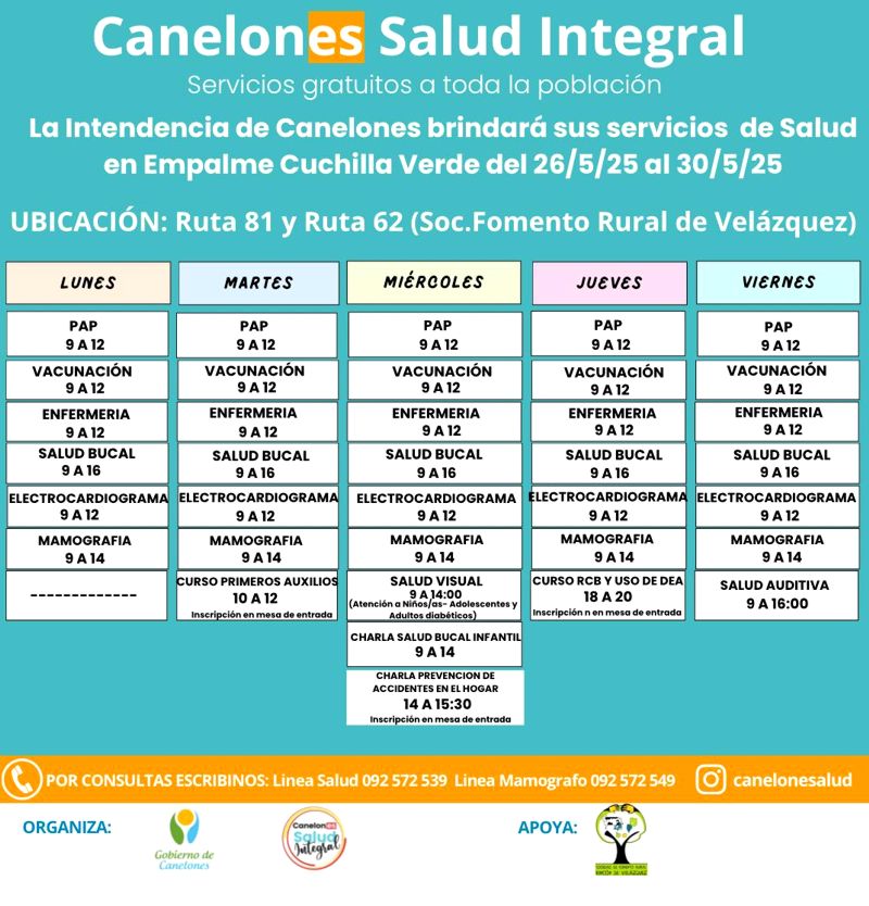 La Intendencia de Canelones brinda sus servicios de Salud en Empalme Cuchilla Verde, hasta el 30 de mayo, en Ruta 81 y Ruta 62 (Soc. Fomento Rural de Velázquez)